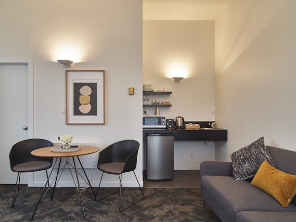 Our Deluxe King Studio is luxurious, spacious and complete with a king bed, a small kitchen, and a private bathroom.