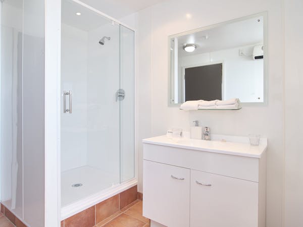 Our One Bedrooms have open living plan dining & lounge area. They offer one King bed and one double bed, with a balcony or terrace with ranch sliding doors.